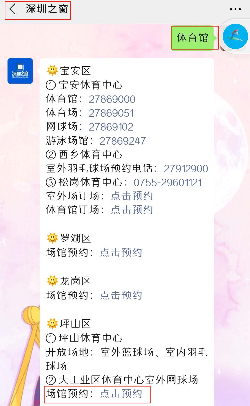 微信搜索关注【深圳之窗】公众号,对话框发送关键词【体育馆】即可获取深圳各区体育场馆预订入口及开放详情。